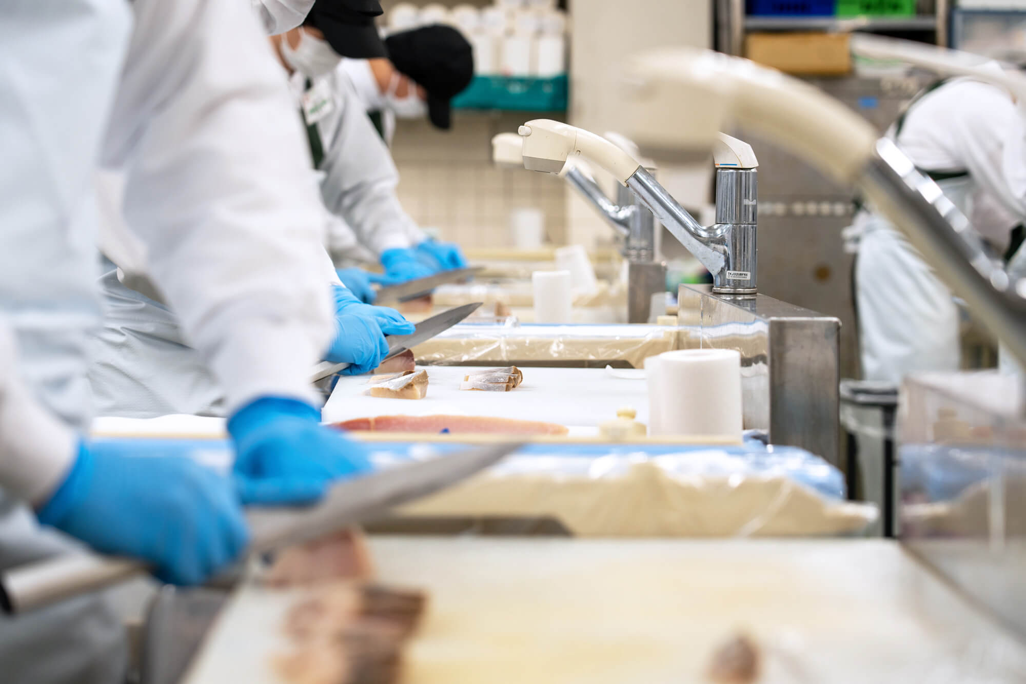 加工場で魚を捌き、切り身やお刺身、お寿司などに加工して、パックに詰めて売場に出します。 - 13:00