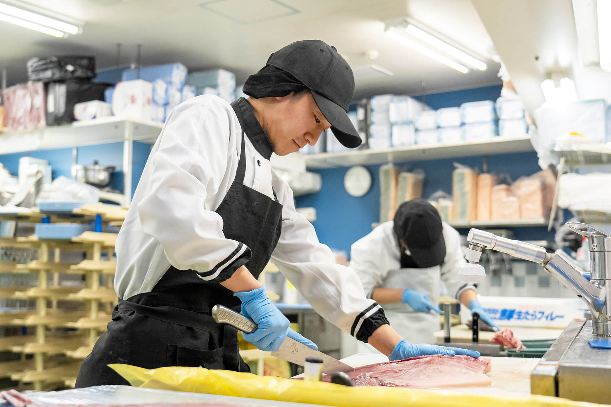 実は、私は入社するまで包丁を握った経験がありませんでした。加工技術や商品知識等は、入社後に技能研修センターで基本から学びました。はじめは小さな魚からスタートし、魚の体や骨構造を学び、次第に大きな魚や難しい魚の加工に挑戦していきます。さらに実際に自分で捌いた魚を食べてみることで、身の厚さや洗浄の仕方など、加工技術がその味に大きく影響することを体感したことが、魚を捌いたりお客様に提案したりするうえで非常に役立っています。